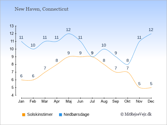 Grafen viser antallet af solskinstimer i New Haven (d.v.s. det gennemsnitlige antal timer pr. dag hvor solen skinner), samt antallet af nedbørsdage (d.v.s. det gennemsnitlige antal dage i en given måned,