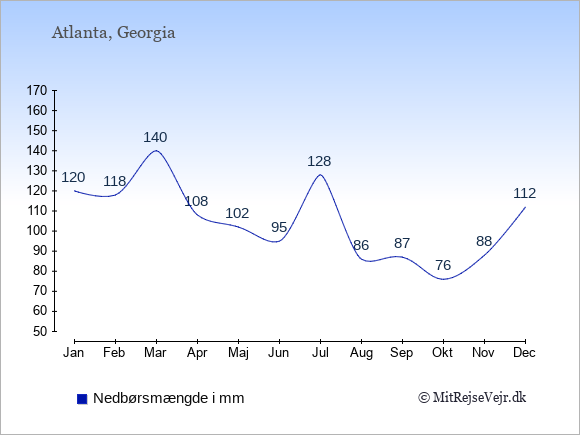 Hvis du vil se, hvordan vejret i Atlanta adskiller sig fra vejret derhjemme, kan du sammenligne tallene måned for måned med de tilsvarende tal for Danmark under Atlanta: klima & vejr.