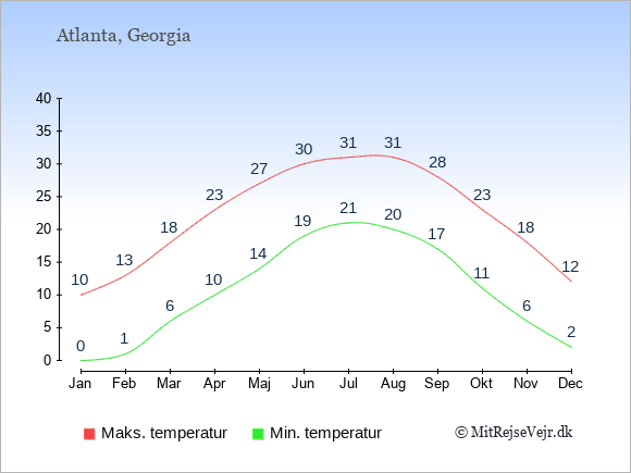 Grafen viser de gennemsnitlige maksimale temperaturer i Atlanta (som oftest den værdi, der er målt midt på dagen) og de gennemsnitlige minimale temperaturer (som oftest den værdi, der er målt midt om natten).