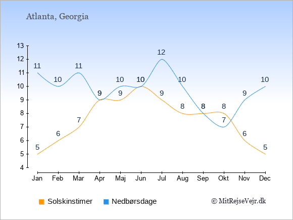 Grafen viser antallet af solskinstimer i Atlanta (d.v.s. det gennemsnitlige antal timer pr. dag hvor solen skinner), samt antallet af nedbørsdage (d.v.s. det gennemsnitlige antal dage i en given måned,