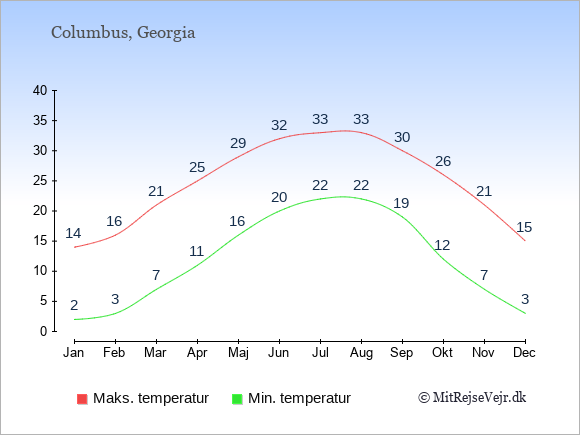 Grafen viser de gennemsnitlige maksimale temperaturer i Columbus (som oftest den værdi, der er målt midt på dagen) og de gennemsnitlige minimale temperaturer (som oftest den værdi, der er målt midt om natten).