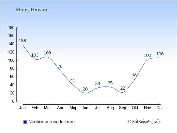 Hvis du vil se, hvordan vejret på Maui adskiller sig fra vejret derhjemme, kan du sammenligne tallene måned for måned med de tilsvarende tal for Danmark under Maui: klima & vejr.