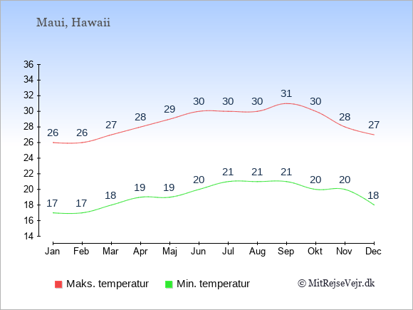 Grafen viser de gennemsnitlige maksimale temperaturer på Maui (som oftest den værdi, der er målt midt på dagen) og de gennemsnitlige minimale temperaturer (som oftest den værdi, der er målt midt om natten).