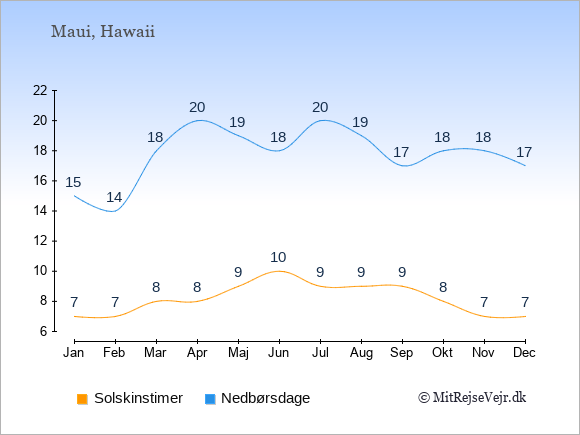 Grafen viser antallet af solskinstimer på Maui (d.v.s. det gennemsnitlige antal timer pr. dag hvor solen skinner), samt antallet af nedbørsdage (d.v.s. det gennemsnitlige antal dage i en given måned,