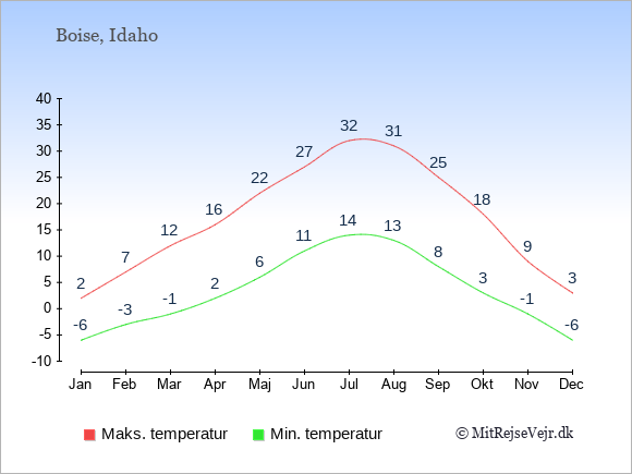 Grafen viser de gennemsnitlige maksimale temperaturer i Boise (som oftest den værdi, der er målt midt på dagen) og de gennemsnitlige minimale temperaturer (som oftest den værdi, der er målt midt om natten).