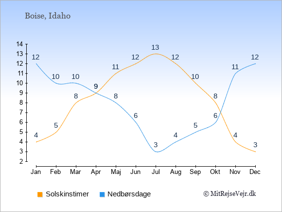 Grafen viser antallet af solskinstimer i Boise (d.v.s. det gennemsnitlige antal timer pr. dag hvor solen skinner), samt antallet af nedbørsdage (d.v.s. det gennemsnitlige antal dage i en given måned,