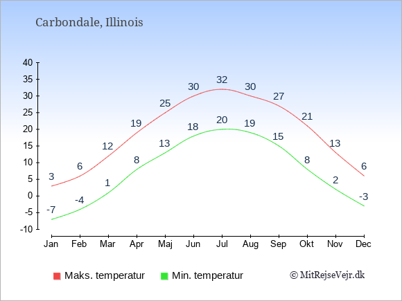 Grafen viser de gennemsnitlige maksimale temperaturer i Carbondale (som oftest den værdi, der er målt midt på dagen) og de gennemsnitlige minimale temperaturer (som oftest den værdi, der er målt midt om natten).