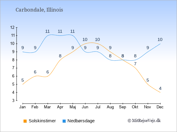 Grafen viser antallet af solskinstimer i Carbondale (d.v.s. det gennemsnitlige antal timer pr. dag hvor solen skinner), samt antallet af nedbørsdage (d.v.s. det gennemsnitlige antal dage i en given måned,