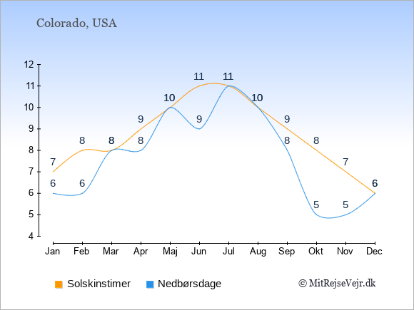 Graferne viser det gennemsnitlige antal solskinstimer i Colorado pr. dag samt det gennemsnitlige antal dage med nedbør i Colorado sammenlignet med København.