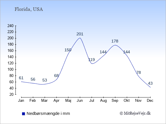 Graferne viser det gennemsnitlige antal solskinstimer i Florida pr. dag samt det gennemsnitlige antal dage med nedbør i Florida sammenlignet med København.