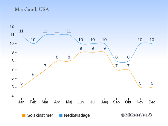 Graferne viser det gennemsnitlige antal solskinstimer i Maryland pr. dag samt det gennemsnitlige antal dage med nedbør i Maryland sammenlignet med København.