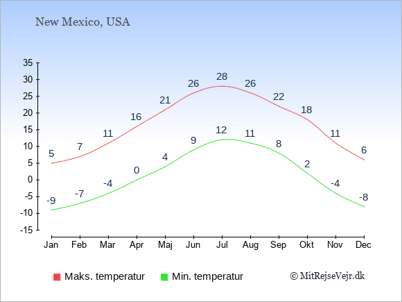 Graferne viser de gennemsnitlige maksimale temperaturer i New Mexico og København (typisk når solen står højest på himmelen om eftermiddagen) og de gennemsnitlige minimale temperaturer (typisk den laveste temperatur som måles om natten).