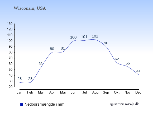 Se klimadata for Wisconsin sammenlignet med klimaet i Danmark.