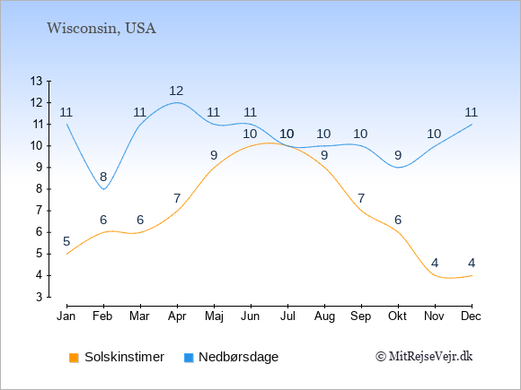 Graferne viser det gennemsnitlige antal solskinstimer i Wisconsin pr. dag samt det gennemsnitlige antal dage med nedbør i Wisconsin sammenlignet med København.