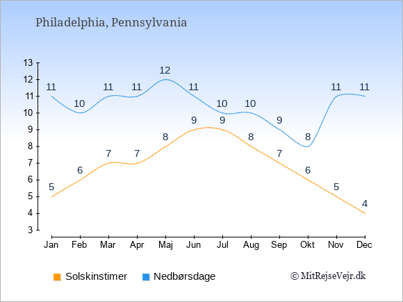 Graferne viser det gennemsnitlige antal solskinstimer i Philadelphia pr. dag samt det gennemsnitlige antal dage med nedbør i Philadelphia sammenlignet med København.