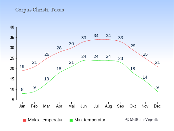Graferne viser de gennemsnitlige maksimale temperaturer i Corpus Christi og København (typisk når solen står højest på himmelen om eftermiddagen) og de gennemsnitlige minimale temperaturer (typisk den laveste temperatur som måles om natten).