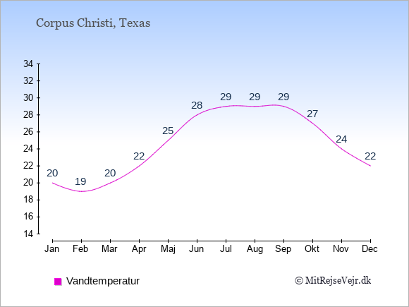 Her på siden kan du få et samlet overblik over det gennemsnitlige klima i Corpus Christi måned for måned sammenlignet med klimaet i København. Oplysningerne om det historiske klima kan du bruge til at planlægge din ferie og finde det bedste tidspunkt at rejse til Corpus Christi på.