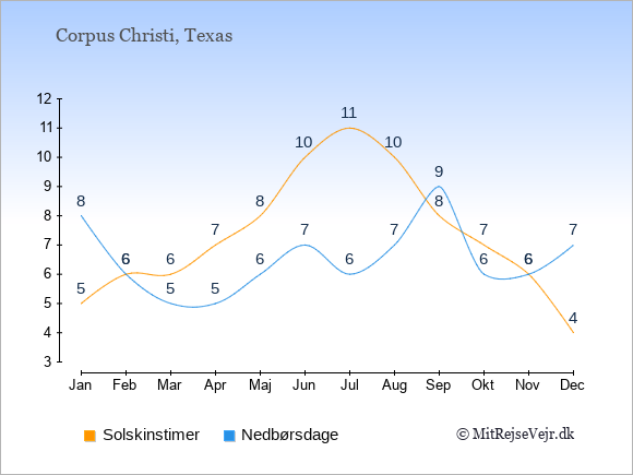 Graferne viser det gennemsnitlige antal solskinstimer i Corpus Christi pr. dag samt det gennemsnitlige antal dage med nedbør i Corpus Christi sammenlignet med København.