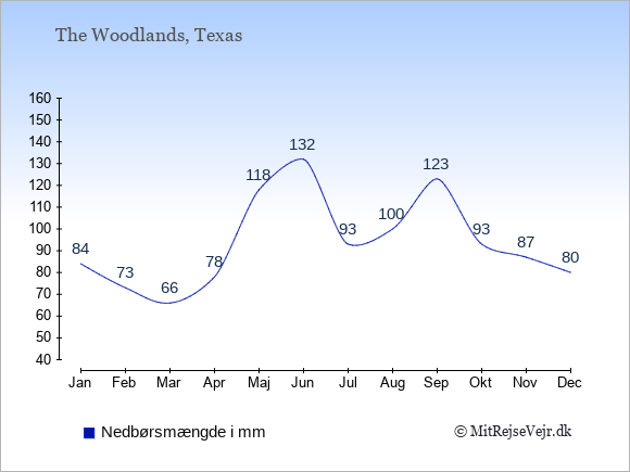Se også vejret i The Woodlands året rundt uden data for København.