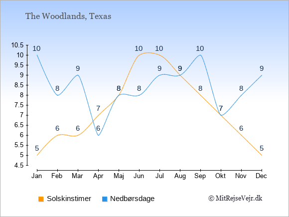Graferne viser det gennemsnitlige antal solskinstimer i The Woodlands pr. dag samt det gennemsnitlige antal dage med nedbør i The Woodlands sammenlignet med København.