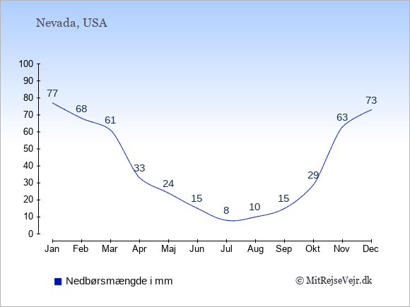 Hvis du vil se, hvordan vejret i Nevada adskiller sig fra vejret derhjemme, kan du sammenligne tallene måned for måned med de tilsvarende tal for Danmark under Nevada: klima & vejr.