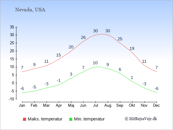 Grafen viser de gennemsnitlige maksimale temperaturer i Nevada (som oftest den værdi, der er målt midt på dagen) og de gennemsnitlige minimale temperaturer (som oftest den værdi, der er målt midt om natten).