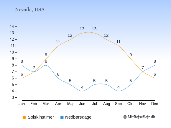 Grafen viser antallet af solskinstimer i Nevada (d.v.s. det gennemsnitlige antal timer pr. dag hvor solen skinner), samt antallet af nedbørsdage (d.v.s. det gennemsnitlige antal dage i en given måned,