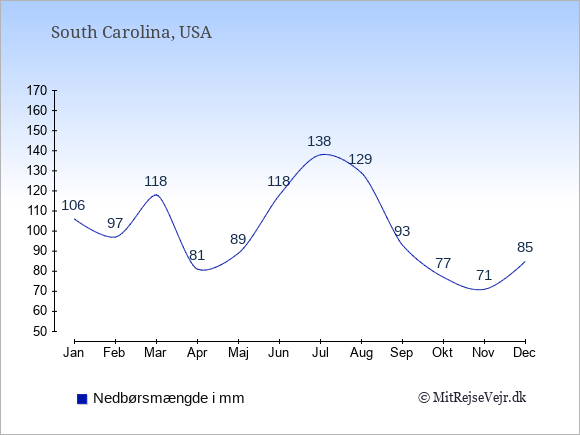 Hvis du vil se, hvordan vejret i South Carolina adskiller sig fra vejret derhjemme, kan du sammenligne tallene måned for måned med de tilsvarende tal for Danmark under South Carolina: klima & vejr.
