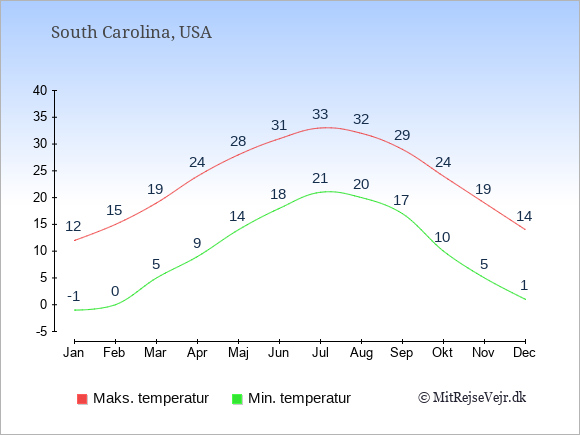 Grafen viser de gennemsnitlige maksimale temperaturer i South Carolina (som oftest den værdi, der er målt midt på dagen) og de gennemsnitlige minimale temperaturer (som oftest den værdi, der er målt midt om natten).
