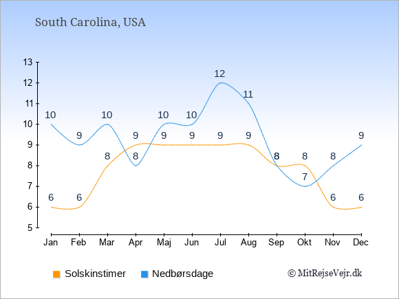 Grafen viser antallet af solskinstimer i South Carolina (d.v.s. det gennemsnitlige antal timer pr. dag hvor solen skinner), samt antallet af nedbørsdage (d.v.s. det gennemsnitlige antal dage i en given måned,