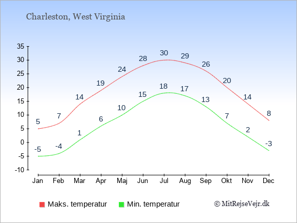 Grafen viser de gennemsnitlige maksimale temperaturer i Charleston (som oftest den værdi, der er målt midt på dagen) og de gennemsnitlige minimale temperaturer (som oftest den værdi, der er målt midt om natten).