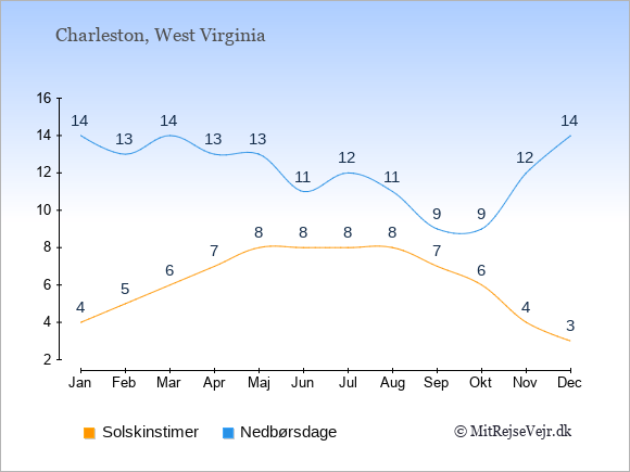 Grafen viser antallet af solskinstimer i Charleston (d.v.s. det gennemsnitlige antal timer pr. dag hvor solen skinner), samt antallet af nedbørsdage (d.v.s. det gennemsnitlige antal dage i en given måned,