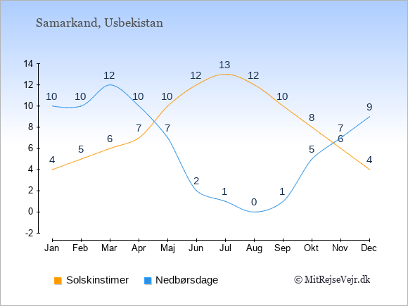 Graferne viser det gennemsnitlige antal solskinstimer i Samarkand pr. dag samt det gennemsnitlige antal dage med nedbør i Samarkand sammenlignet med København.