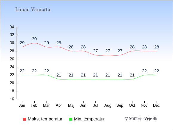 Grafen viser de gennemsnitlige maksimale temperaturer på Linua (som oftest den værdi, der er målt midt på dagen) og de gennemsnitlige minimale temperaturer (som oftest den værdi, der er målt midt om natten).