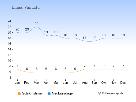 Grafen viser antallet af solskinstimer på Linua (d.v.s. det gennemsnitlige antal timer pr. dag hvor solen skinner), samt antallet af nedbørsdage (d.v.s. det gennemsnitlige antal dage i en given måned,