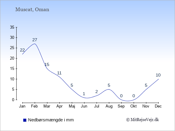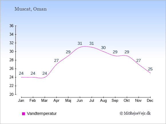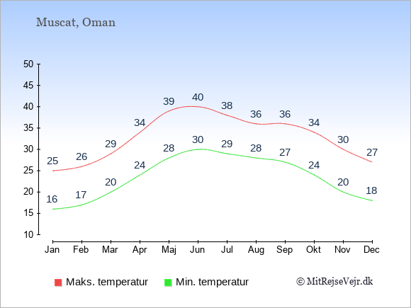Normalt vil temperaturen i Oman (Muscat) i en given måned derfor befinde sig i intervallet mellem den gennemsnitlige maksimale og minimale temperatur. I juli måned vil der f.eks. gennemsnitligt være op til ca. 38 grader om dagen
