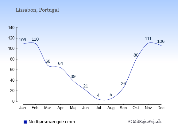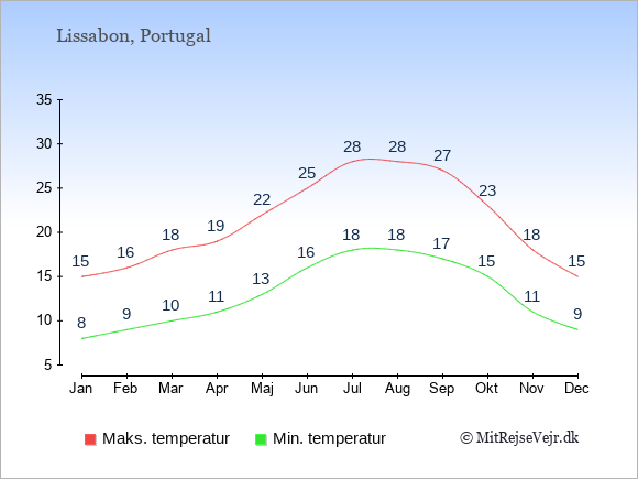 Normalt vil temperaturen i Portugal (Lissabon) i en given måned derfor befinde sig i intervallet mellem den gennemsnitlige maksimale og minimale temperatur. I juli måned vil der f.eks. gennemsnitligt være op til ca. 28 grader om dagen