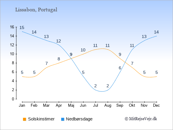 Grafen viser antallet af solskinstimer i Portugal (d.v.s. det gennemsnitlige antal timer pr. dag hvor solen skinner), samt antallet af nedbørsdage (d.v.s. det gennemsnitlige antal dage i en given måned,