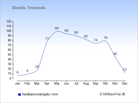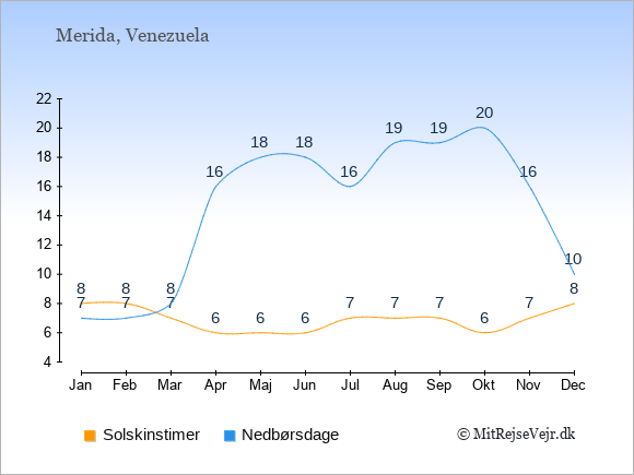 Graferne viser det gennemsnitlige antal solskinstimer i Merida pr. dag samt det gennemsnitlige antal dage med nedbør i Merida sammenlignet med København.