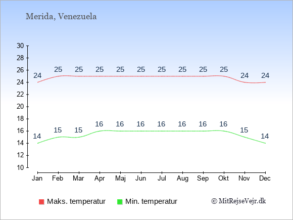 Graferne viser de gennemsnitlige maksimale temperaturer i Merida og København (typisk når solen står højest på himmelen om eftermiddagen) og de gennemsnitlige minimale temperaturer (typisk den laveste temperatur som måles om natten).