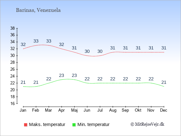 Grafen viser de gennemsnitlige maksimale temperaturer i Barinas (som oftest den værdi, der er målt midt på dagen) og de gennemsnitlige minimale temperaturer (som oftest den værdi, der er målt midt om natten).