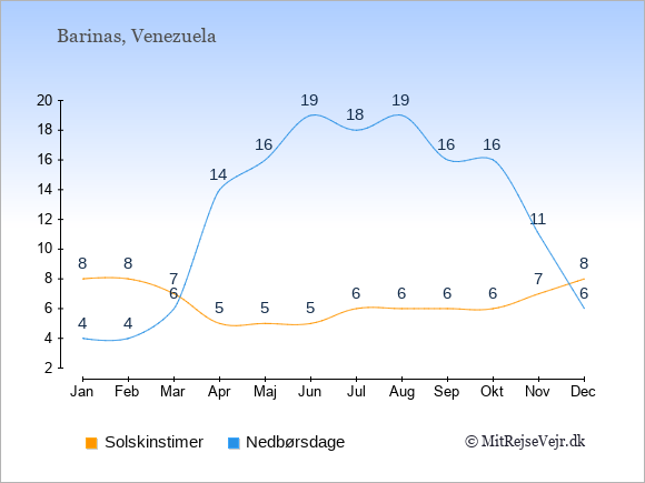 Grafen viser antallet af solskinstimer i Barinas (d.v.s. det gennemsnitlige antal timer pr. dag hvor solen skinner), samt antallet af nedbørsdage (d.v.s. det gennemsnitlige antal dage i en given måned,