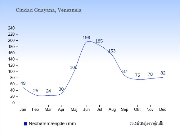 Få et samlet overblik over vejret i Ciudad Guayana året rundt med temperaturer, solskinstimer og nedbør.