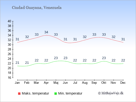 Grafen viser de gennemsnitlige maksimale temperaturer i Ciudad Guayana (som oftest den værdi, der er målt midt på dagen) og de gennemsnitlige minimale temperaturer (som oftest den værdi, der er målt midt om natten).