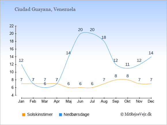 Grafen viser antallet af solskinstimer i Ciudad Guayana (d.v.s. det gennemsnitlige antal timer pr. dag hvor solen skinner), samt antallet af nedbørsdage (d.v.s. det gennemsnitlige antal dage i en given måned,