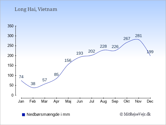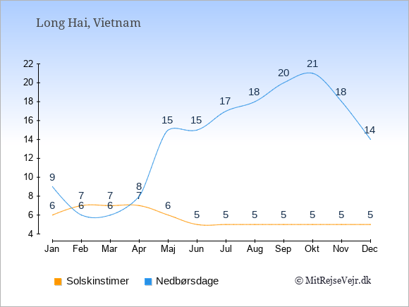 Graferne viser det gennemsnitlige antal solskinstimer i Long Hai pr. dag samt det gennemsnitlige antal dage med nedbør i Long Hai sammenlignet med København.