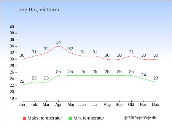 Graferne viser de gennemsnitlige maksimale temperaturer i Long Hai og København (typisk når solen står højest på himmelen om eftermiddagen) og de gennemsnitlige minimale temperaturer (typisk den laveste temperatur som måles om natten).