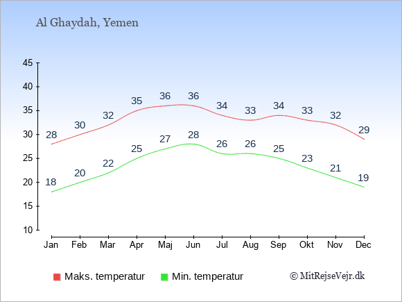 Grafen viser de gennemsnitlige maksimale temperaturer i Al Ghaydah (som oftest den værdi, der er målt midt på dagen) og de gennemsnitlige minimale temperaturer (som oftest den værdi, der er målt midt om natten).