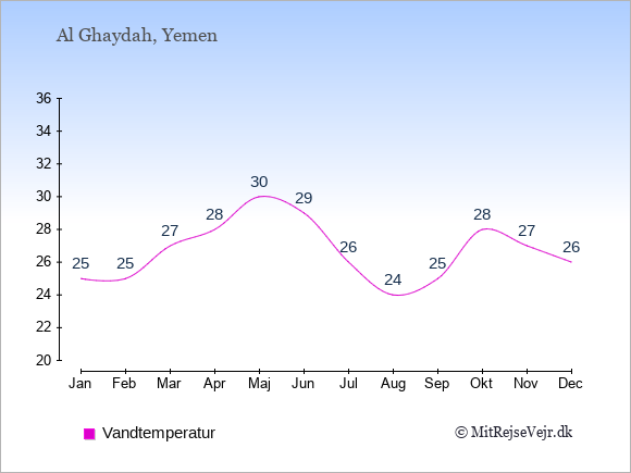 Få et samlet overblik over vejret i Al Ghaydah året rundt med temperaturer, vandtemperatur, solskinstimer og nedbør.