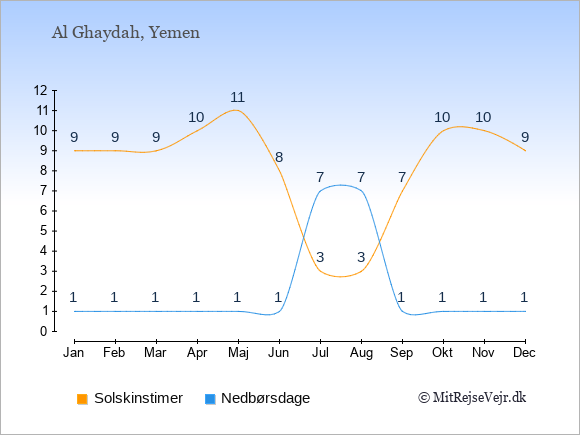 Grafen viser antallet af solskinstimer i Al Ghaydah (d.v.s. det gennemsnitlige antal timer pr. dag hvor solen skinner), samt antallet af nedbørsdage (d.v.s. det gennemsnitlige antal dage i en given måned,